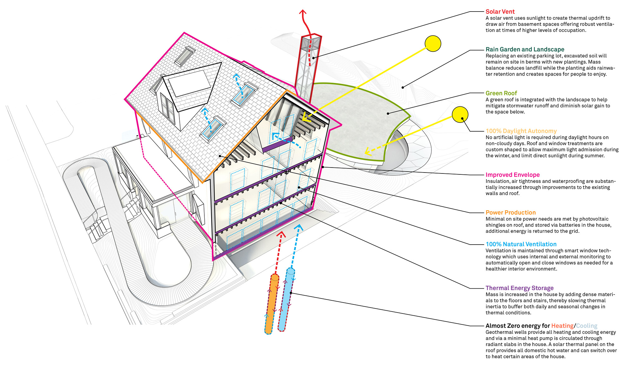 Air heated by those solar panels in winter when the sun s angle is lower will be fed into the floor heating radiant system which will reduce the energy demand on the heater coil.